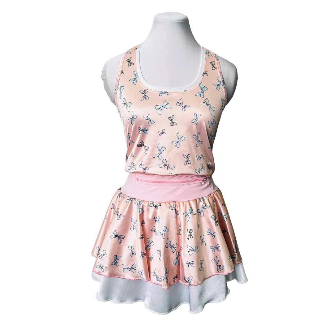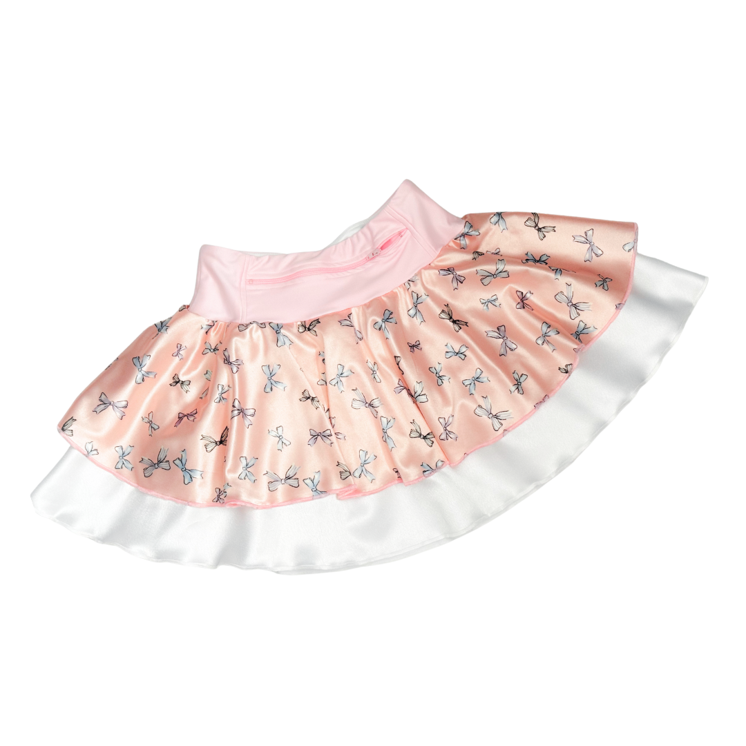 Three layers; White Satin, Pink with bows stretch satin print and white under tulle