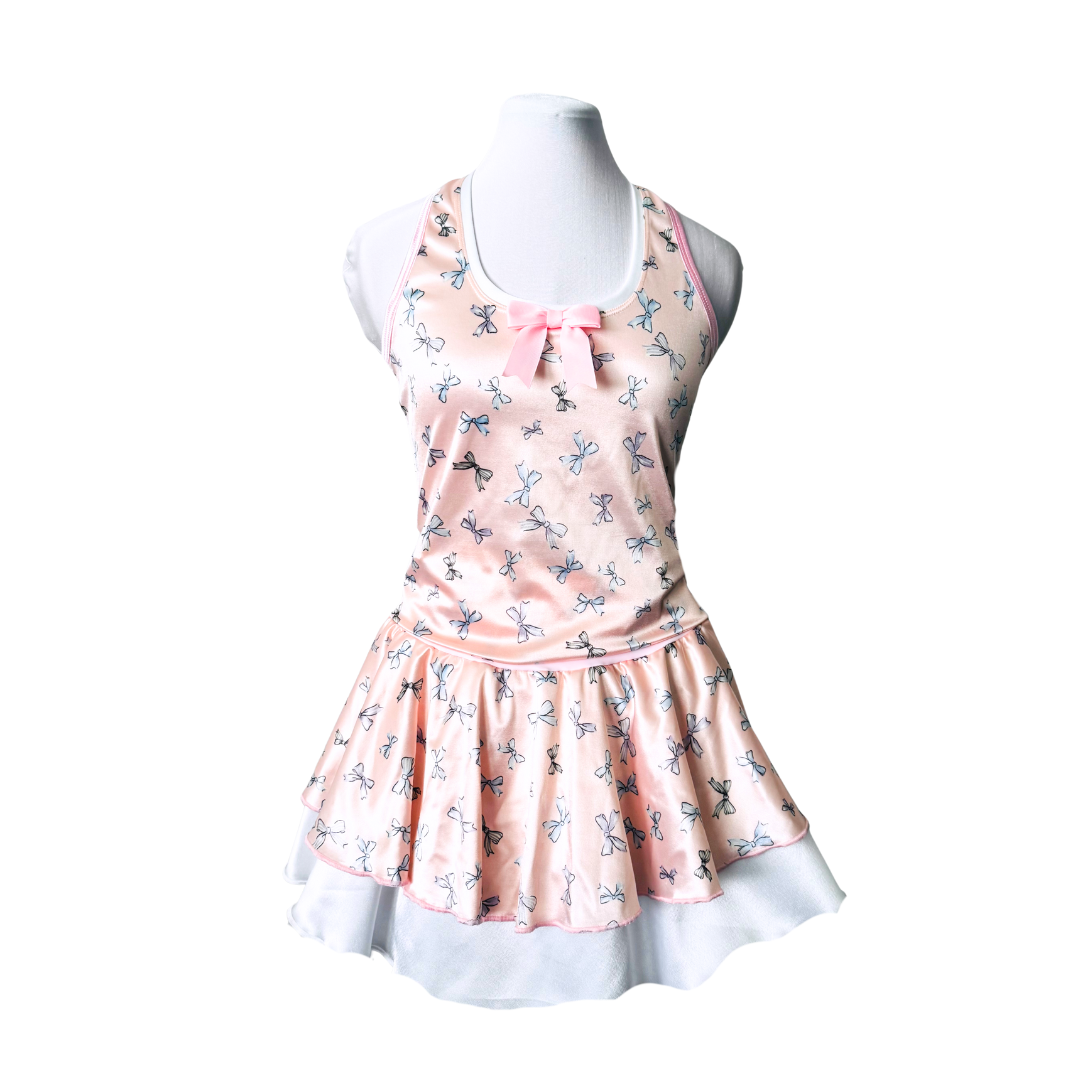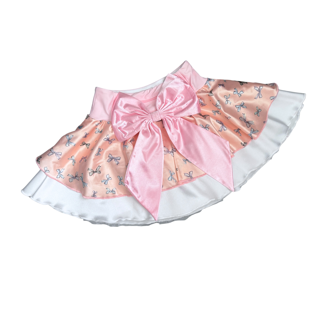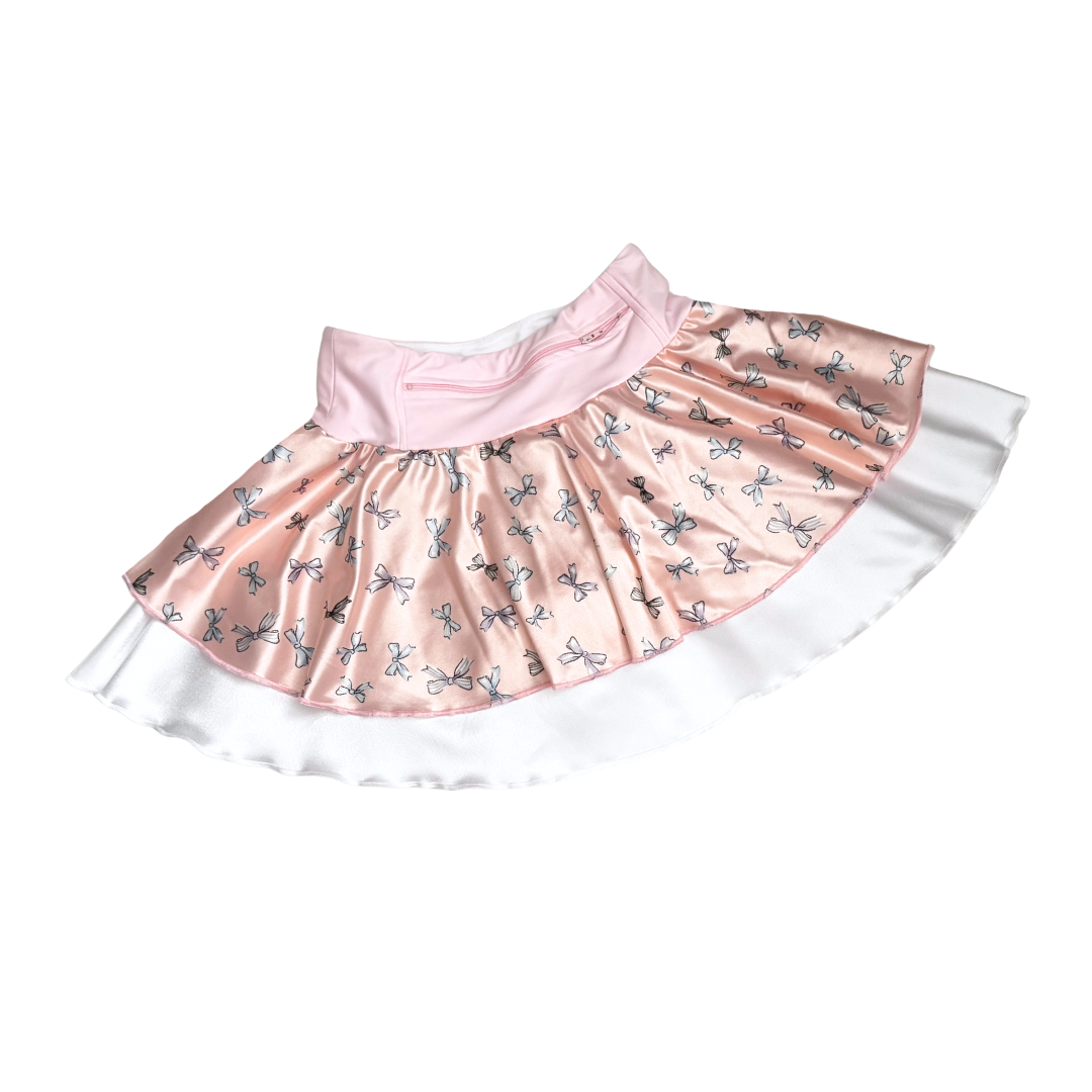 Three layers; White Satin, Pink with bows stretch satin print and white under tulle