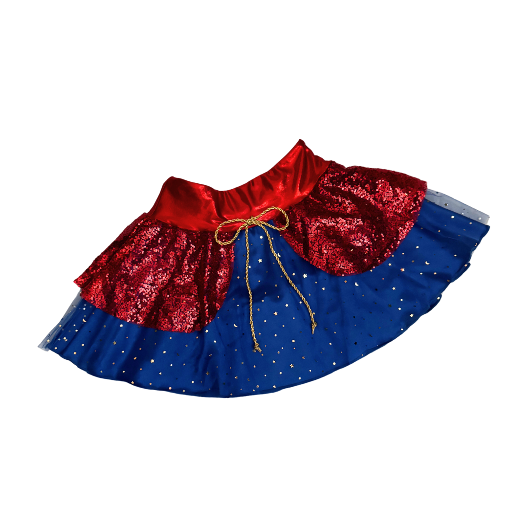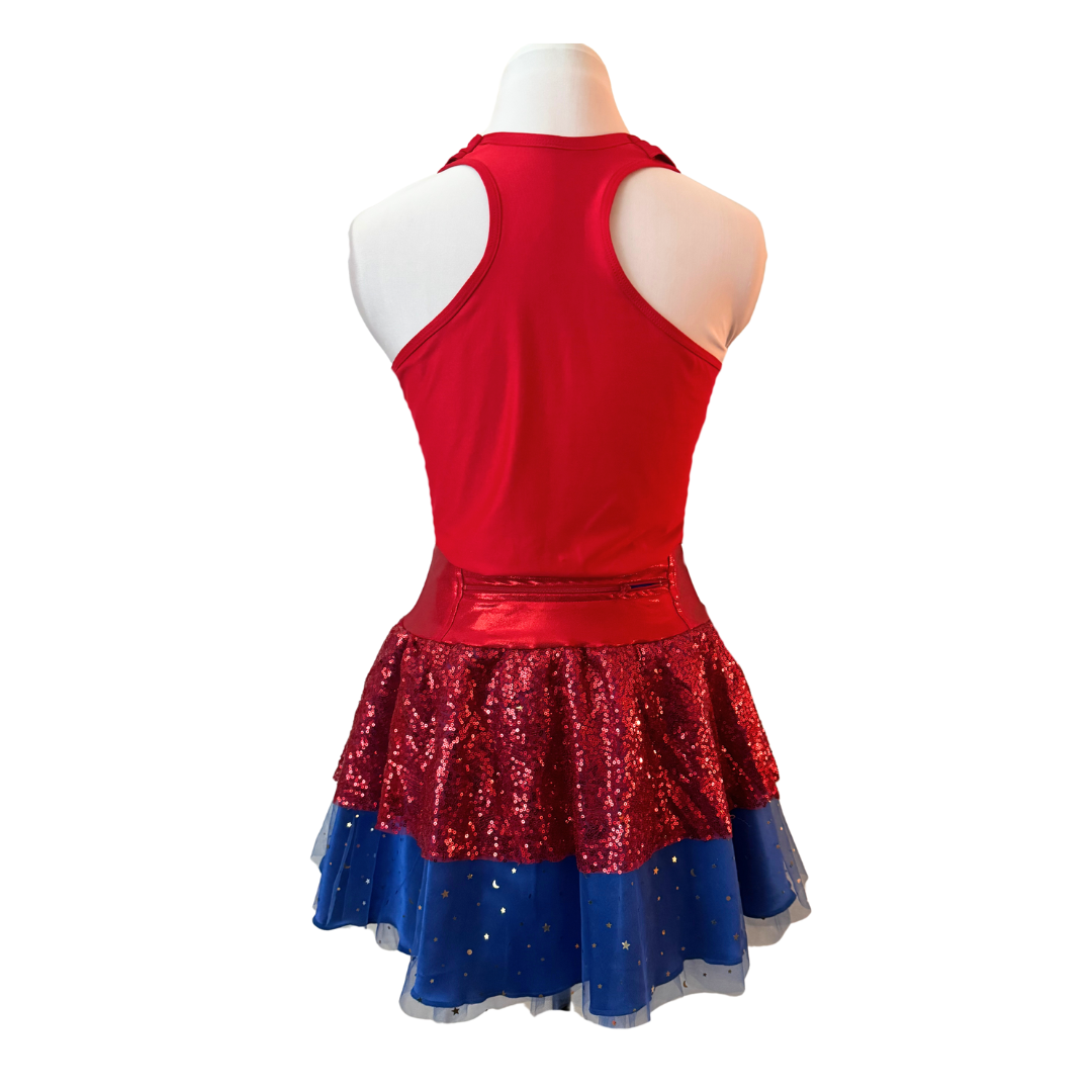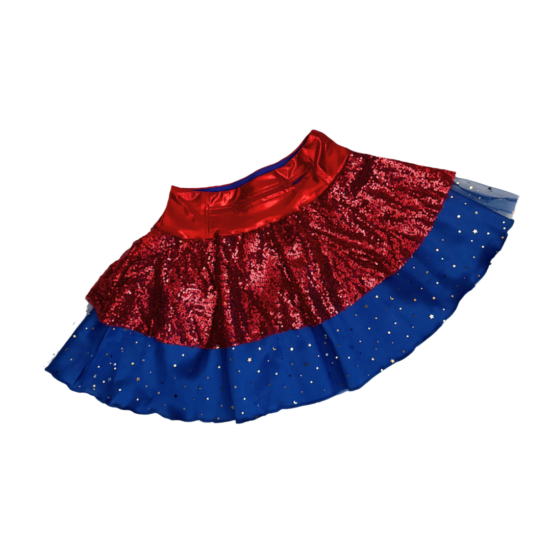 Three layer skirt; Imported royal blue mesh with gold stars over satin, Red small sequined over layer and under tulle for fullness