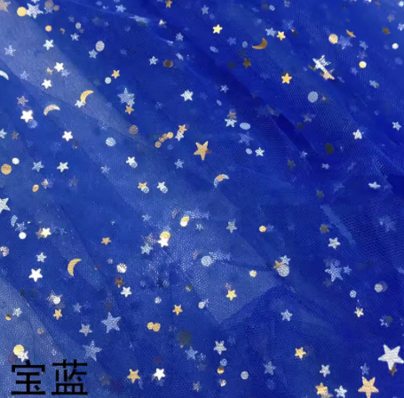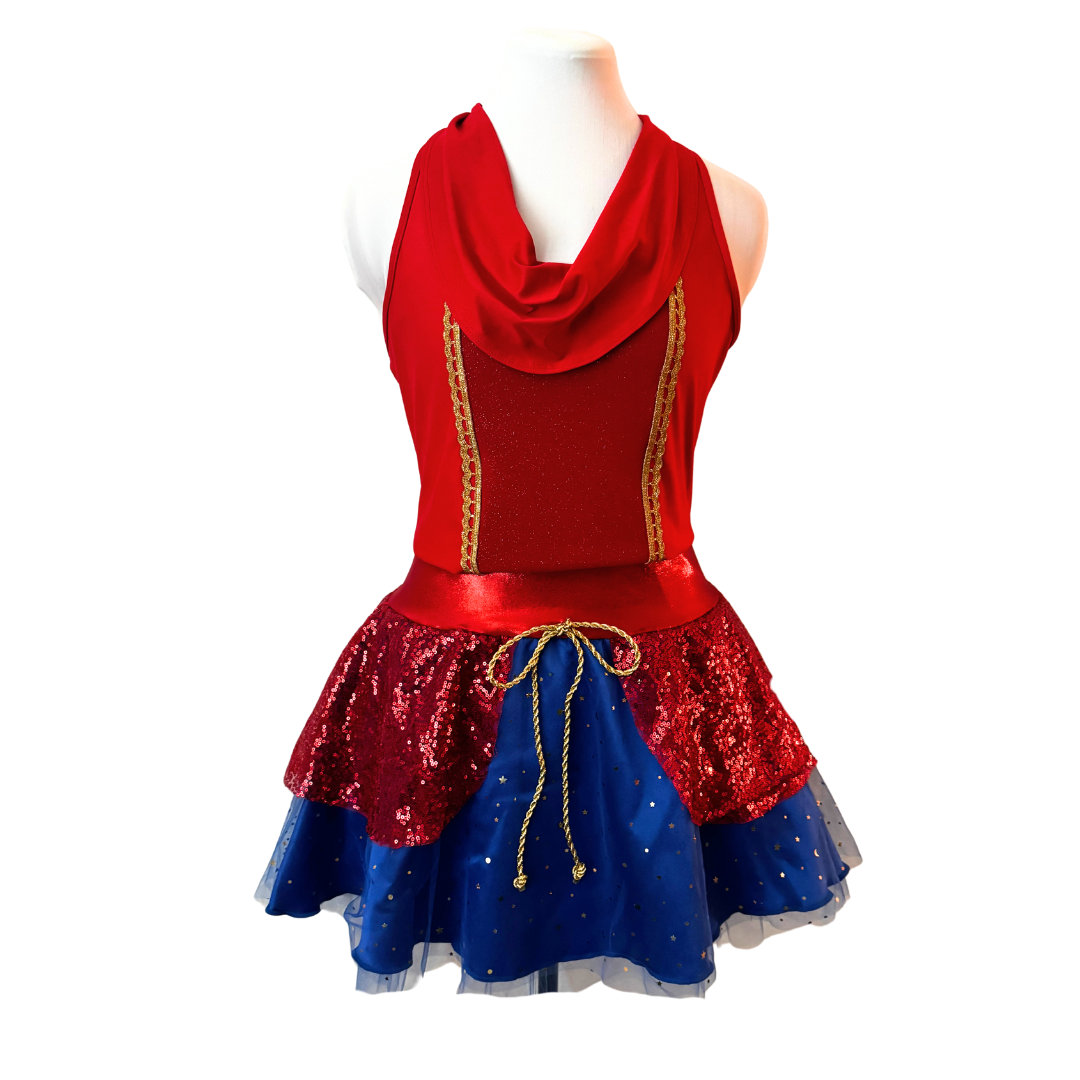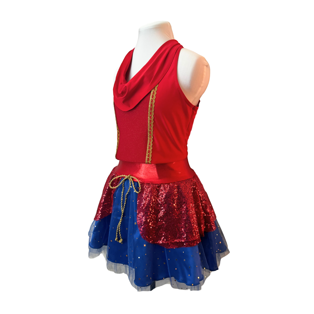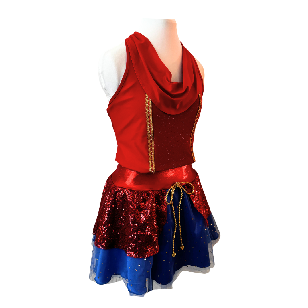 Three layer skirt; Imported royal blue mesh with gold stars over satin, Red small sequined over layer and under tulle for fullness